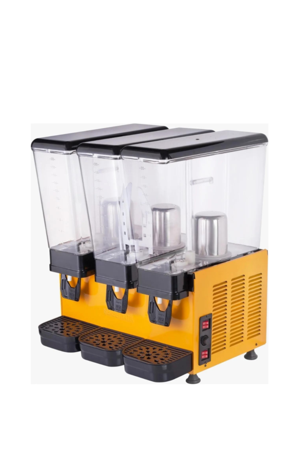 Şerbetmatik Üçlü 20+20+20 LT Karıştırıcılı soğutucu ayran makinesi doğal parçacıksız meyve suyu, ayran ve şalgam sularının soğutulması ve dağıtılması için tasarlanmış tezgah üstü soğuk içecek dispenseri. Hazne ortası soğutma sistemi ile içeceği son damlasına kadar eşit olarak soğutur termostatlı soğutma sistemi sayesinde %15 Enerji tasarrufu sağlar. Geniş musluk hortumu sayesinde akışkanlık sağlar. Sınıfının en düşük çalışması ses seviyesi. 20+20+20 Litre kapasitelidir. Üç farklı renk seçenekleri( Siyah, Sarı, Paslanmaz) Uzun ömürlü kompresör. Gıdaya uygun tıkanmaz silikon musluk. Ayarlanabilen ayaklar sayesinde zeminde topallama yapmaz. ; Manyetik fıskiyeli karıştırma sistemi sayesinde özellikle parçacıksız meyve sularının, ayranın ve şalgamın soğutulması ve dağıtılması İçin tasarlanmış tezgah üstü dispenser geniş soğutma tabanı sayesinde içecekler daha hızlı ve son damlasına kadar eşit olarak soğur bu sayede klasik ürünlere göre %50’ye varan enerji tasarrufu sağlar. ; Pratik musluk sistemi tek el kullanılarak rahatça içecek alabilmeyi sağlar. Geniş musluk hortumu hızlı dolum sağlar ve kolaylıkla sökülüp temizlenebilir. Manyetik fıskiye sistemi sayesinde hazne içinde bulunan içeceğin alt motor bölümüne sızma riski ortadan kalkar, bu sayede motorun ömrü uzar. Fıskiyenin eşit dağıtım özelliği sayesinde içecek azalsa bile iştah açıcı görsellik değişmez. Mükemmel temizlik ve hijyen için içecek ile temas eden tüm parçalara kolayca ulaşılır ve hızlı bir şekilde temizlenebilir. Polikarbon hazne darbeye dayanıklı ve gıda kullanımına uygundur. Küçük ve orta ölçekli işletmeler için uygun çözümdür. Damlalıkta bulunan seviye göstergesi sayesinde atık suyun taşmadan önce boşaltılması gerektiği rahatlıkla fark edilir. Daha detaylı bilgi için bizlere ulaşabilirsiniz. Ölçüler:48x50x72 Ağırlık: 40 Kg Enerji: 220 Volt – 50 Hz Litre: 20+20+20 Litre 2 yıl garantilidir.
