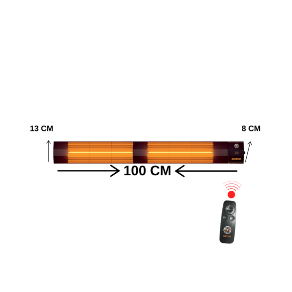 DİKKAT DUVAR MODELİ ISITICIDIR KUTU İÇERİĞİNDE ASKI İÇİN 4 ADET L DEMİR (VİDALARI İLE BİRLİKTE), 2 ADET DÜBEL (VİDALARI İLE BİRLİKTE) VE GARANTİ BELGESİ MEVCUTTUR. DAYANIKLI ALÜMİNYUM GÖVDE SİYAH STATİC BOYA IP 67 SUYA VE TOZA KARŞI KORUMA 3 KADEMELİ MANUEL KONTROL BUTONU UZAKTAN KUMANDA KUMANDADAN 6 AYRI ISI AYARI KADEMESİ ZAMANLAYICI İLE OTOMATİK KAPATMA DEVRİLME EMNİYETİ 3600 WATT ISITMA GÜCÜ ÖZEL RÜZGARDAN VE HAVA AKIMINDAN ETKİLENMEYEN HALOJEN REZİSTANS Sunstar yeni nesil Uzaktan kumandalı 6 kademeli ısıtıcı. Devrilme emniyetli. Açık ve kapalı alanları (cafe, spor salonu, restaurant, otel, bahçe, kışlık, ev, ofis, vb) daha az maliyetle ısıtın; Yeni Nesil Isıtıcı Rüzgardan ve Hava Akımından Etkilenmez Diğer Sistemlere Göre %80 Daha Verimli Çalışır Açık ve Kapalı Alanları Kolayca Isıtır Voltaj220; 240V Heartz50; 60 Hz Power:3600 W Isıtma Alanı (kapalı alan)20 ; 28 m2 Isıtma Alanı (açıkalan)16; 20 m2. Boyutları: 100 cm uzunluk, 13cm yükseklik, 8 cm derinlik. 2 yıl garantilidir.